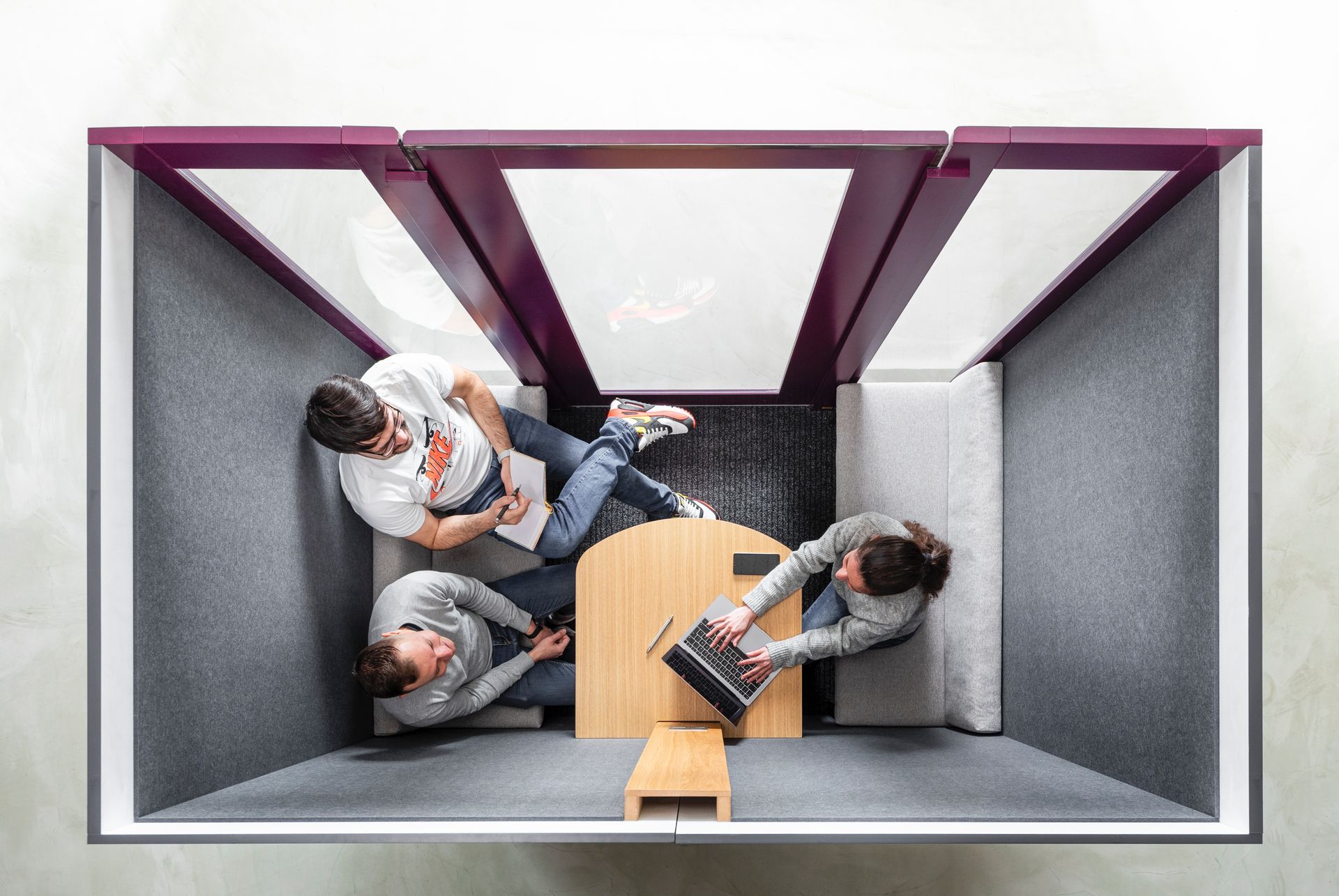 Cabina acústica modelo CAMDEN. Disponible en dos tamaños: Camden TWO y Camden FOUR. El interior combina elegancia y confort. Además, sus propiedades acústicas son excepcionales.