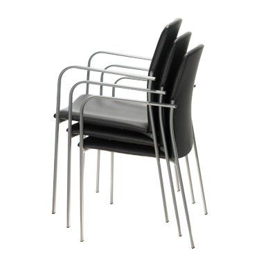 Colección de sillas multifuncionales para colectividades, oficinas y uso confidente. Cuentan con asiento, respaldo y trasera tapizados y estructura metálica de cuatro patas en tubo de acero elíptico acabado en epoxi plata, blanco o cromado.